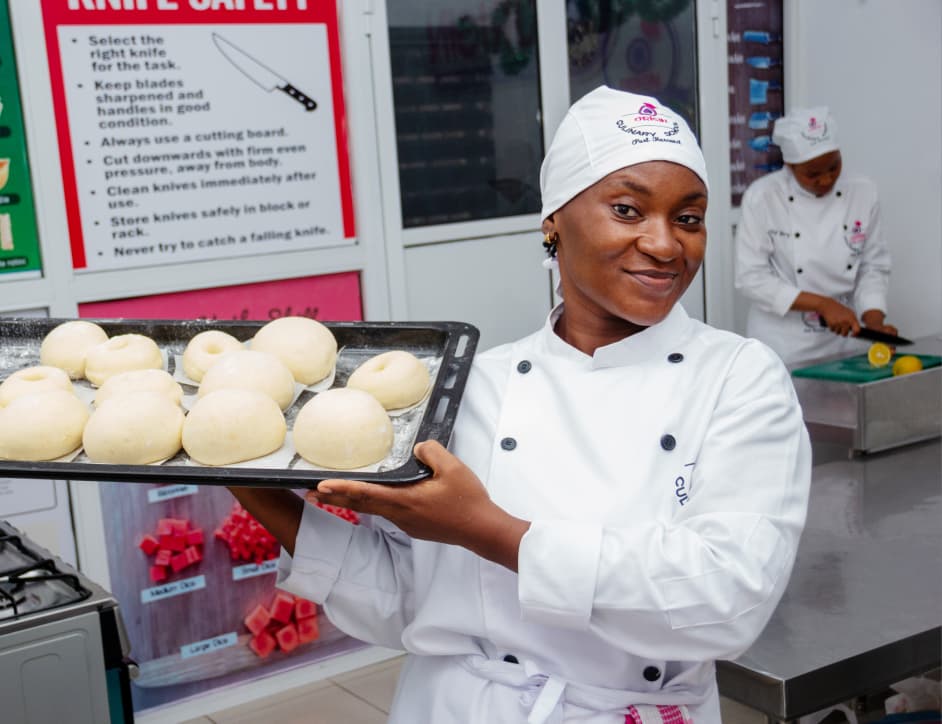 Our Courses Explore our range of courses designed to turn you into a culinary master. Professional Chef Certificate(Cuisine) Mon-wedTime:9am Duration:3monthsCourse fee:N500,000 Registration fee; N30,000 Learn More Professional Chef Certificate(Pastry) Mon-WedTime:9amDuration: 3monthsCourse fee:N500,000 Registration fee: N30,000 Learn More Diploma In the Art of Cuisine Weekdays-(Mon -weds – 3months and Mon – Fri -3months)Time:9amDuration: 6monthsCourse fee:N900,000 Registration fee; N30,0000 Learn More Diploma In the Art of Pastry Weekdays-(Mon -weds – 3months and Mon – Fri -3months)Time:9amDuration: 6monthsCourse fee:N900,000 Registration fee: N30,000 Learn More Diploma in Culinary Art Level 1 (Pastry & Cuisine) Mon-wedTime:9amDuration: 6monthsCourse fee: N900,000 Registration fee: N30,000 Learn More Diploma In Culinary Art Level 2(Pastry & Cuisine) Weekdays- (Mon -weds – 6months and Mon – Fri -3months/Internship)Time:9amDuration: 9monthsCourse fee:N1,350,000 Registration fee: N30,0000 Learn More Advanced Diploma in Culinary Art-(Pastry & Cuisine) Weekdays)- (Mon -Weds – 6months and Mon– Fri -6months/Internship)Time:9amDuration: 1 yearCourse fee: N1,800,000Registration fee: N30,000 Learn More The Art of Pastries (Mon-Wed)Time:9amDuration: 3 weeksCourse fee: N250,000 Registration fee; N30,000 Learn More African Culinary Art Certificate – Level 1 (Mon-Wed)Time:9amDuration: 2 weeksCourse fee: N200,000 Registration fee N30,000 Learn More African Culinary Art Certificate – Level 2 Thurs-Sat Time:10amDuration: 2 weeksCourse fee: N250,000 Registration fee: N30,0000 Learn More Continental And Oriental Culinary Art Certificate- Stream 1 Mon-WedTime:9amDuration: 3 weeksCourse fee:N350,000 Registration fee; N30,000 Learn More Continental And Oriental Culinary Art Certificate- Stream 2 Thur-SatTime:10amDuration: 3 weeksCourse fee:N550,000 Registration fee; N30,000 Learn More Cake Baking Art Certificate (Mon-Wed)Time:9amDuration: 2 weeksCourse fee:N300,000 Registration fee; N30,000 Learn More Bread Making Certificate Mon-wedTime:9am Duration:3monthsCourse fee:500k Registration fee; 30,0000 Learn More Kitchen And Food Safety Certificate Thur-Fri/SatTime:10amDuration: 2daysCourse fee:N100,000 Registration fee; N30,000 Learn More Bartending And Mixologist Certificate Weekday/SaturdayTime:10amDuration:3 daysCourse fee:N150,000 Registration fee; N30,000 Learn More